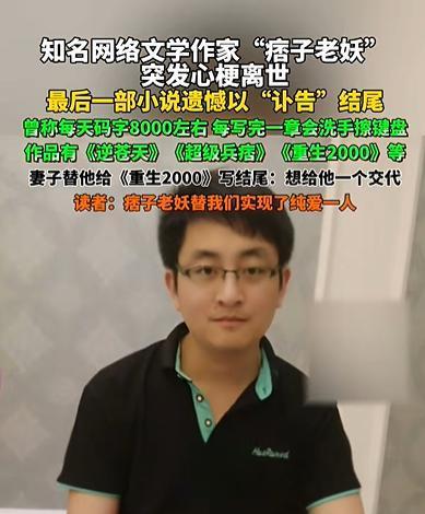 近日,多位网文博主发文称,七猫中文网签约作家“痞子老妖”于2025年11月16日因突发心梗离世。记者查询到,其最后一部小说《重生2000》第1991章末尾,自称“痞子老妖”爱人发布了一份讣告,称作者“痞子老妖”11月16日因为心梗突然离世,她帮“痞子老妖”为小说补充上了结尾。12月10日,七猫中文网在1992章再次发布讣告,送别“痞子老妖”。12月12日,记者拨打了七猫中文网客服电话,客服人员证实作者“痞子老妖”已经离世,平台在接到反馈后,将作者讣告信息公布在最后一部小说结尾章节。